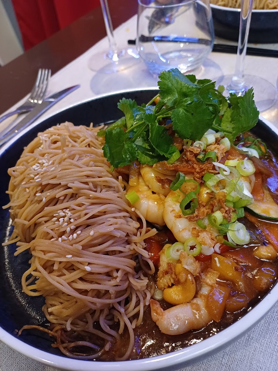 Repas très copieux et délicieux ! Plat préparé au moment de la commande On choisi la composition de son plat : nouilles sautées ou riz , poulet porc bœuf ou crevette et sa sauce saté, caramel, curry .... a chacun sa recette Très bonne accueil Menu enfant avec plusieurs choix