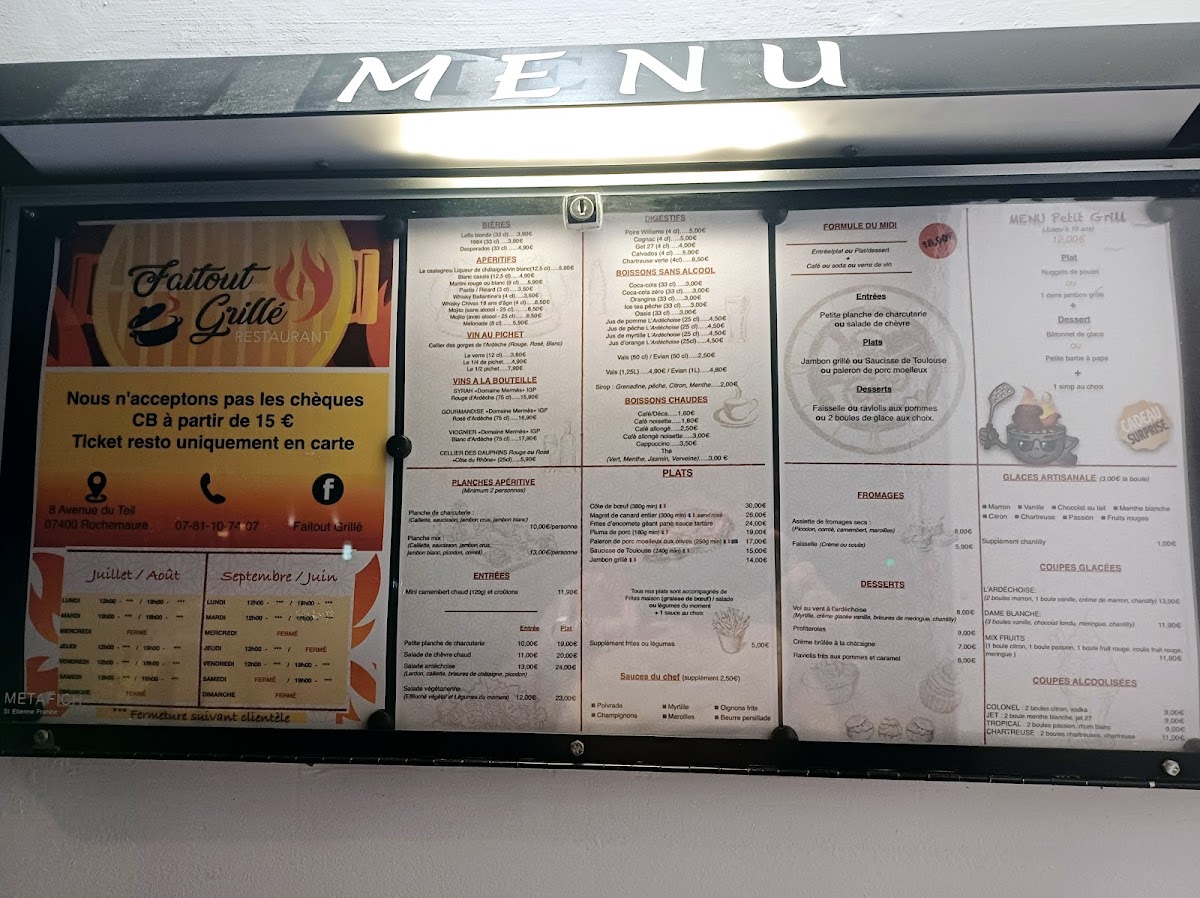 Welcome to Faitout Grille, a hidden gem nestled in Rochemaure, France, where barbecue takes center stage. This vibrant restaurant is known for its inviting atmosphere and exceptional cuisine, featuring fresh, seasonal ingredients that shine in every dish. Guests can savor a variety of options, from hearty starters to indulgent desserts, all prepared with a chef's passion for flavor and quality.